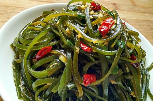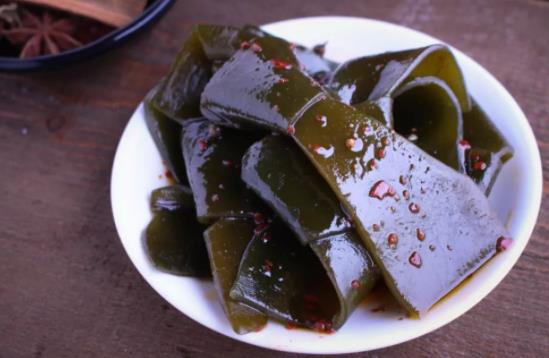將鮮海帶燙煮后,再經冷卻、鹽漬、脫水等工序加工而成的是鹽漬海帶,顏色為墨綠色,以壁厚者為佳,一般用作涼拌菜,食用前用溫水浸泡,可增重3倍左右。