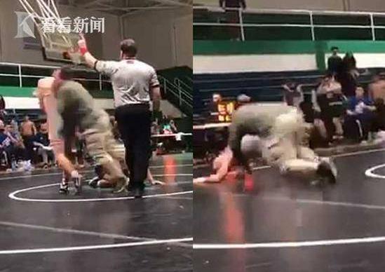 據英國《每日郵報》1月20日報道,事發于北卡羅來納州坎納波利斯,上周六(18日)州高中體育協會舉辦了一場男生摔跤比賽,眾多家長也應邀前來觀摩。視頻顯示兩名男生的對決中,白背心少年抱起黑背心對手,奮力將其過肩摔翻在地,就在后者頭部撞地的一剎那,裁判吹響口哨,并用手勢示意白背心少年“舉動非法”。