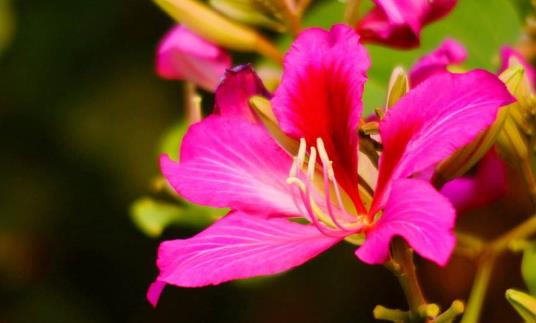 紫荊花,又叫紅花紫荊、洋紫荊、紅花羊蹄甲。葉片心形,圓整而有光澤。花開紫紅色,4~10朵簇生于老枝上,形如蝴蝶。花期4月,在葉前開放。