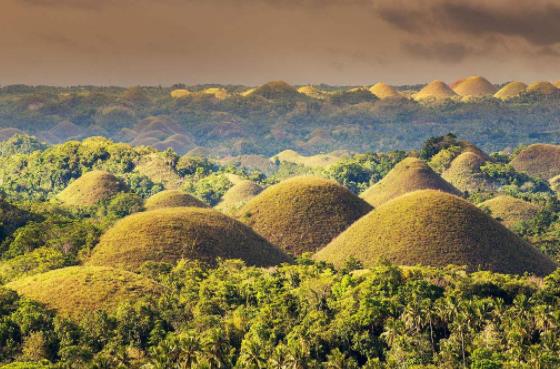 巧克力山是薄荷島著名奇景,由1200多座圓錐形的山組成。它的形成頗具神話色彩。傳說古時有兩個巨人用石頭向對方互相投擲,巨石一個一個掉在地上,便形成了數以千計,造型優美的圓錐型山頭。每逢旱季,山上的草干枯后變為咖啡色,酷似一大堆巧克力,這個讓人垂涎欲滴的名字因此而得。其中兩座山頭已發展成為度假勝地,住宿、餐飲、觀景、娛樂設施業已完備。變成巧克力色是在旱季結束時,這是它名字的由來,而在其余時候就是綠色的。爬到游覽中心頂端可以望見巧克力山的全貌,十分壯觀。