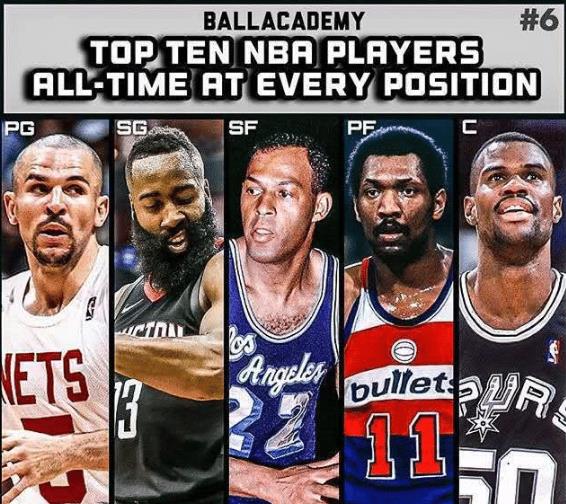 6、賈森-基德、詹姆斯-哈登、埃爾金-貝勒、埃爾文-海耶斯、大衛-羅賓遜