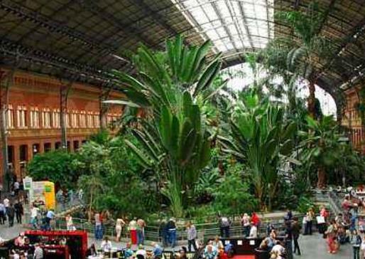 位于西班牙首都馬德里的阿托查火車站不僅是一個交通運輸轉換站,同時還是一個室內植物花園和珍稀動物保護區;疖囌咀钤缃⒂1851年,而后由于火災在1892年進行了重建,并于1992年在室內種植了眾多的樹木植物,現在已經可以看到室內樹木生長繁茂,乘客們可以在樹影下靜候火車。整個室內花園有超過7000株樹木,其中很多都是棕櫚樹,里面還有很多熱帶樹種。沿著花園小道設置了很多座椅。