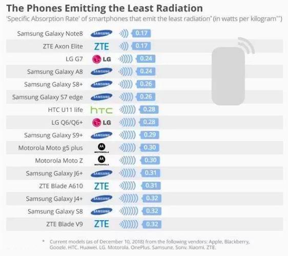 從輻射最低榜單中可以看出,輻射最低的3款手機分別是三星Note 8、中興Axon Elite和LG G7。在輻射最低榜的16部手機中,三星占據8款,包括三星note 8、A8、S8+、S9+等。中興有3款,LG有2款,連在國內幾近消失的摩托若拉也有2款上榜,HTC有1款。作為現在用戶數量非常多的蘋果和華為等品牌并未在榜單看到。