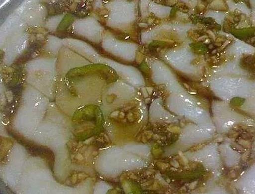 制法為放磨成漿的米粉于簸箕當中上鍋蒸煮,待一層熟透后再逐漸添加,一般都有三層以上。待米粉全熟后,用小刀將其剮成格狀,其表面放上香油、芝麻與蒜蓉漿(即蒜雞油)。入口細膩富有彈性,軟滑而不黏牙,再加上秘制的醬料,香濃而又不膩,那種味道絕對令人難以忘懷。