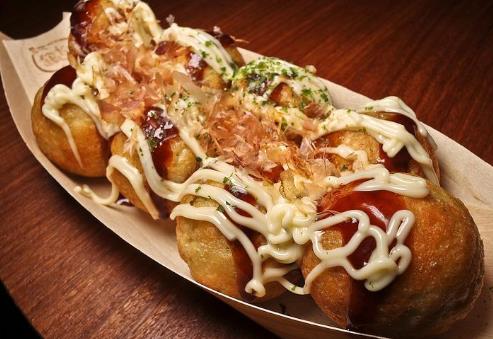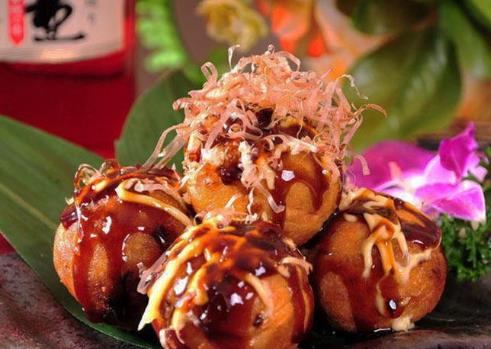 9、小丸子變得金黃,有彈性就好了,裝盤,放上青介辣醬、照燒醬、沙拉醬、海苔粉、柴魚花。