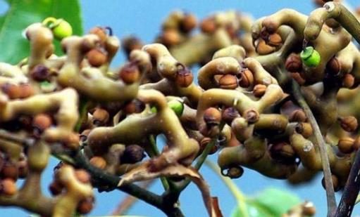 分枝的先端,著生1枚鈍三棱狀圓球形的果實,果皮紙質,甚薄,3室,每室含種子1粒。果柄質稍松脆,易折斷,折斷面略平坦,角質樣,淡紅棕色至紅棕色。氣微弱,味淡,稍甜。