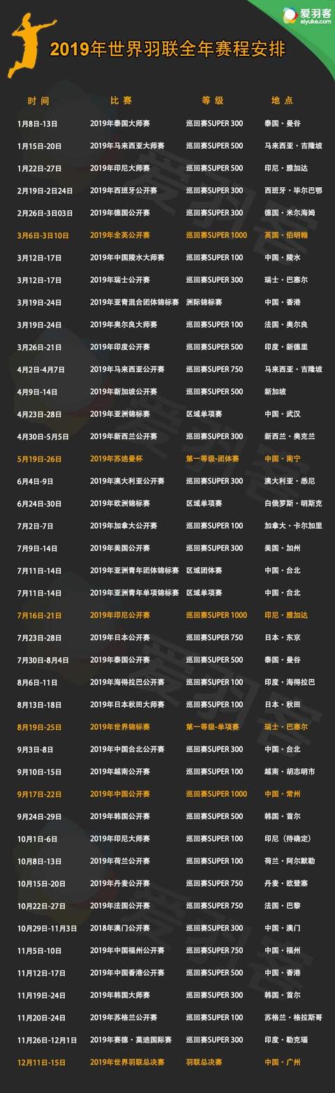 世界羽聯(lián)公布的全年賽程安排,看準(zhǔn)時(shí)間地點(diǎn),精彩不錯(cuò)過(guò)。2019年,多項(xiàng)賽事落戶中國(guó)。下面,和360常識(shí)網(wǎng)一起看看吧。