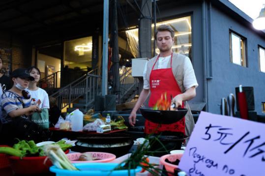 顛勺的洋小伙叫德米日,俄羅斯人,在夜市擺攤賣魚香肉絲蓋澆飯其實為的是一種“人生體驗”。家境優厚的德米日自稱是一個“全球化吃貨”,足跡遍布全球的他,在西班牙當過學徒,在土耳其學過烹飪,還曾在日本修習海鮮料理的秘訣。這段時間在夜市做中餐,他說只為滿足自己的美食夢。
